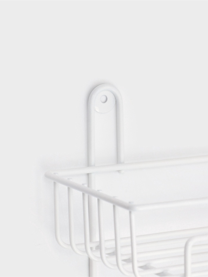 Белый металл не скрывает — организует. Эта полка ”растворяется” в интерьере, оставляя на виду только то, что нужно: флаконы, баночки, свежее полотенце. Она не требует внимания, но делает каждый поход в ванную чуть спокойнее — потому что всё на своём месте.