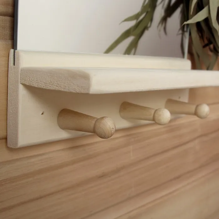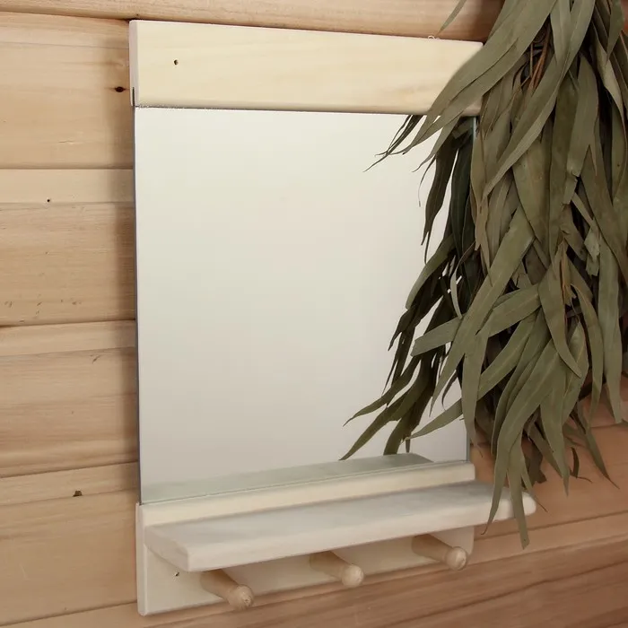 Такое зеркало подойдёт для бани и сауны. Дерево не выделяет вредных веществ при нагревании и подходит для помещений с высокой влажностью.