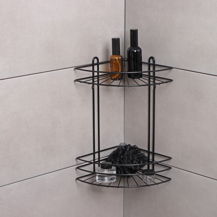 Элегантная угловая полка для ванной с двумя ярусами выполнена из высококачественного металла. Черная матовая текстура делает ее стильным дополнением для любого интерьера. Удобное подвесное крепление и компактные размеры (175×175 мм) позволяют экономить пространство, а высота 36,2 см обеспечивает удобство размещения различных принадлежностей. Отличается влагостойкостью, что гарантирует долговечность использования. Поставляется в собранном виде, готова к установке.