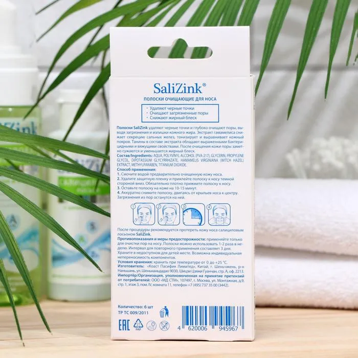Полоски SaliZink удаляют черные точки и глубоко очищают поры, выводя загрязнения и излишки кожного жира. Экстракт гамамелиса снижает секрецию сальных желез, тонизирует и выравнивает кожный покров. Танины в составе экстракта обладают выраженными бактерицидными и вяжущими свойствами. После очищения кожи поры заметно сужаются и уменьшается жирный блеск.