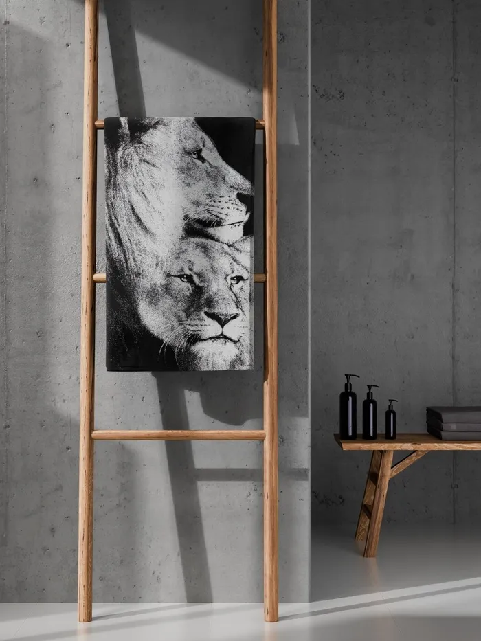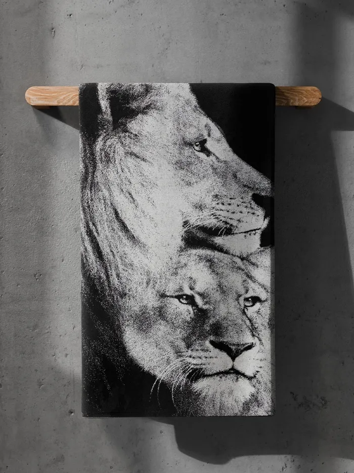 Представьте, как после душа вашу кожу обволакивает мягкое облако из натурального хлопка. Это не просто полотенце — это ваш личный ритуал комфорта с благородным акцентом. Черно-белые львы на плотной махре 420 г/м² создают ощущение особенного утра даже в будний день.