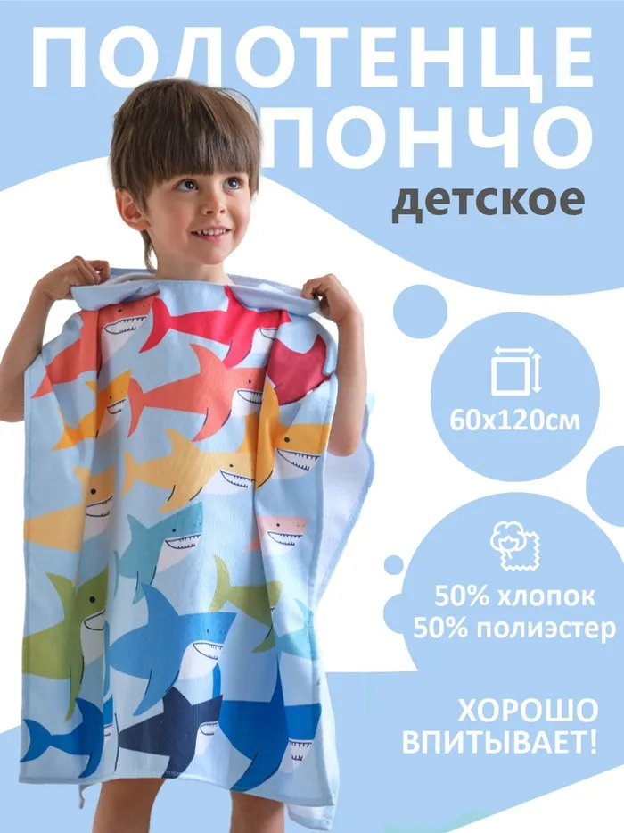 Полотенце-пончо детское махровое Крошка Я "Акулы" 60х120 см, 50% хл, 50% пэ — Характеристики