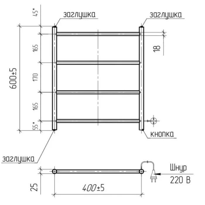 Полотенцесушитель электрический ТЕРА «Классика», 400×600 мм, 4 перекладины, черный — Характеристики