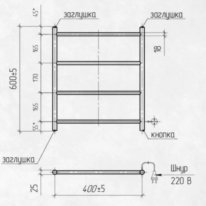 Электрический полотенцесушитель ZEIN PE-04 в стиле "Классика" имеет размеры 400x600 мм и 4 перекладины.