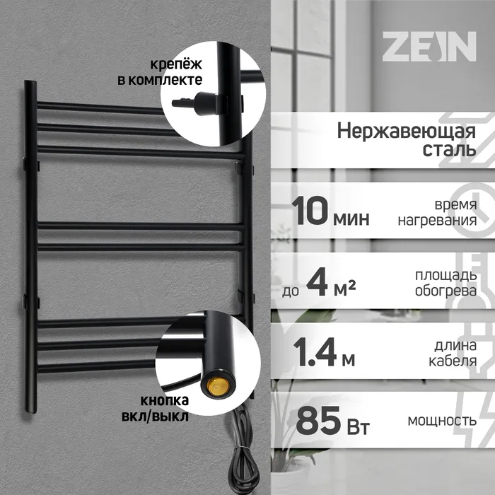 Электрический полотенцесушитель ZEIN PE-08 "Богема" размером 500x600 мм имеет 8 перекладин, что делает его подходящим для компактных ванных комнат. Он обеспечивает эффективную сушку полотенец.