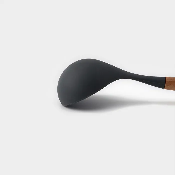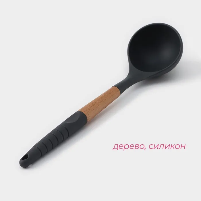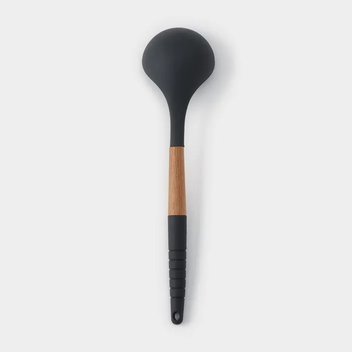 - Выполнен из экологичных материалов. Рукоятка разливной ложки выполнена из натурального дерева. Рабочая часть предмета - из термостойкого пищевого силикона.