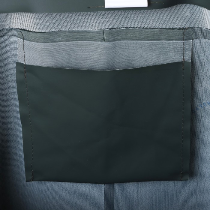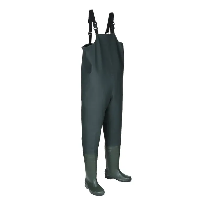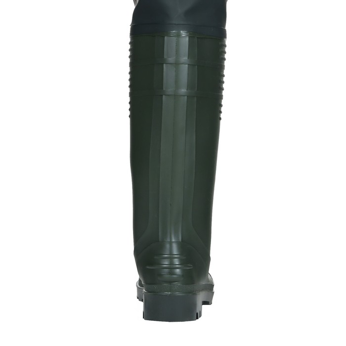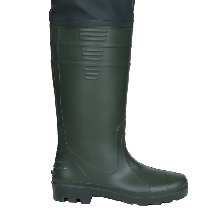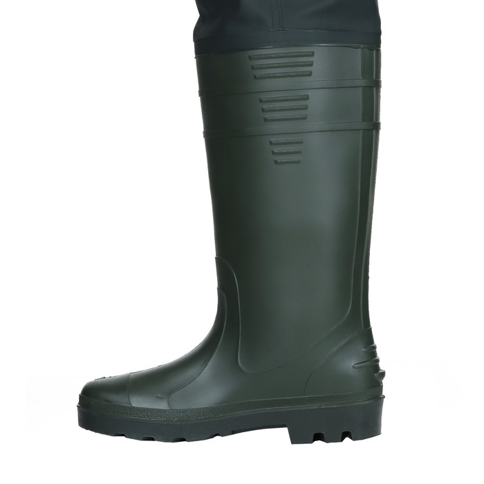 Водонепроницаемый полукомбинезон изготовлен из искусственной кожи (ПВХ) и сапог мужских путем «сваривания» деталей токами высокой частоты. Изделие цельнокроеное, без боковых швов. Верхняя часть полукомбинезона обработана отделочным швом в подгибку.
