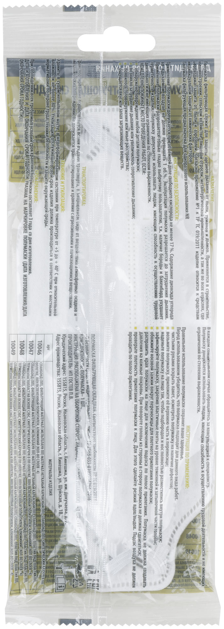 Изготовлена из современных материалов: спанбонд, мельтблаун и нетканый каркасный. Эти материалы гарантируют долговечность и надежную защиту ваших органов дыхания.