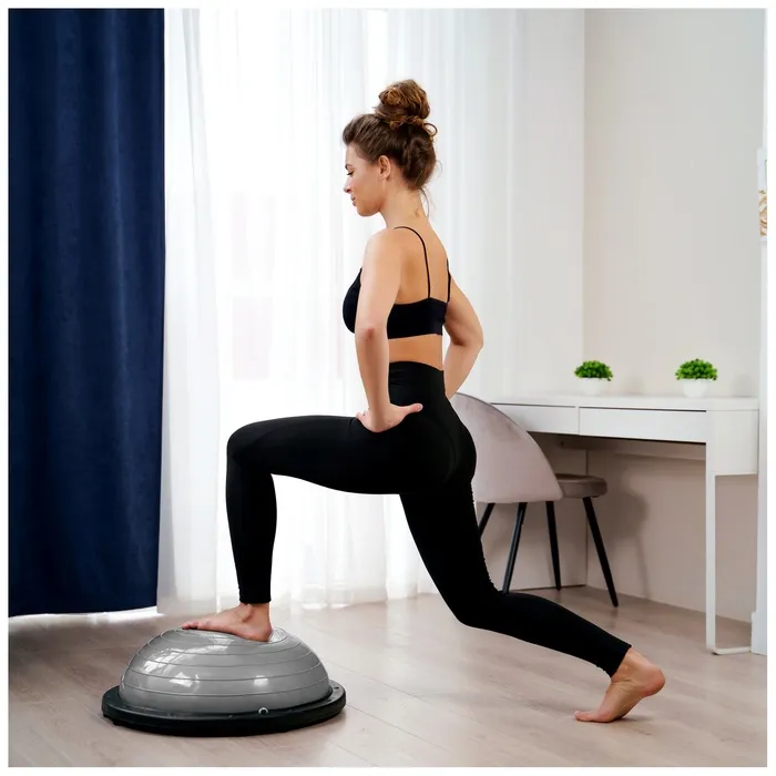 - Выпады с удерживанием носка на полусфере. Опорная нога на полу, колено под прямым углом к полу, руки перед грудью. Вторая нога размещена на полусфере. Приседать нужно медленно, удерживая равновесие.
