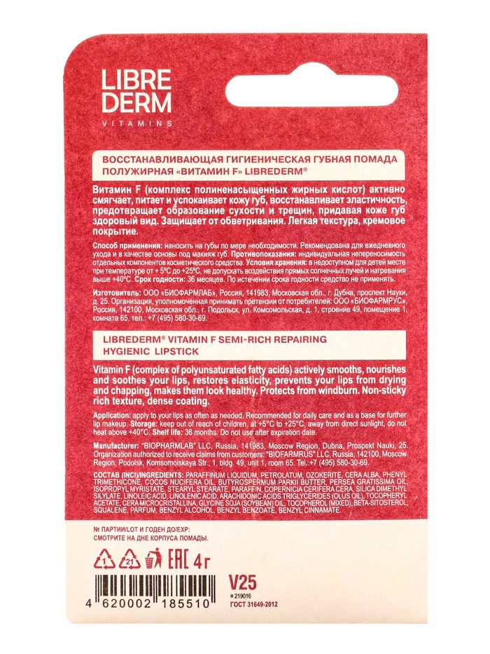 Губная помада Librederm витамин F "Восстанавливающая полужирная" обогащена витамином F, который активно смягчает, питает и успокаивает кожу губ, восстанавливает эластичность, предотвращает образование сухости и трещин, придавая коже губ здоровый вид.