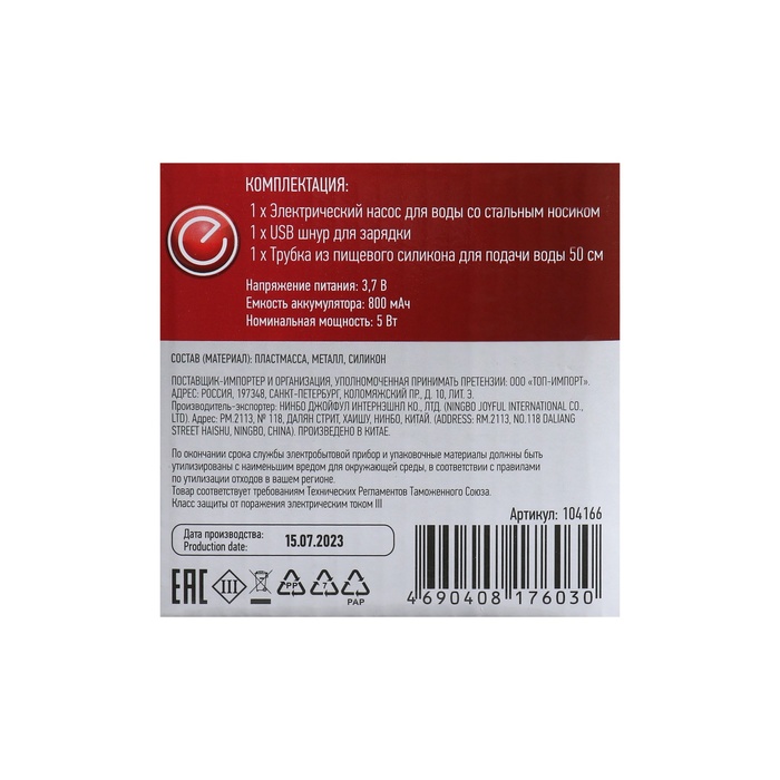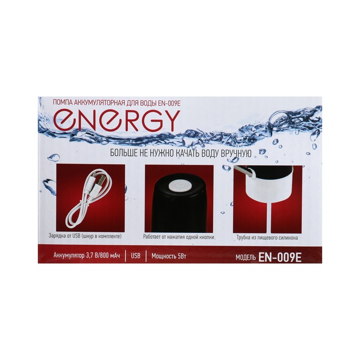 Помпа для воды ENERGY EN-009E, электрическая, 5 Вт, 800 мАч, от USB, чёрная — Характеристики