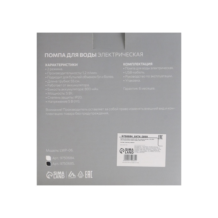 Помпа для воды Luazon LWP-06, электрическая, 5 Вт,800 мАч,порционная подача воды, АКБ, белая — Характеристики