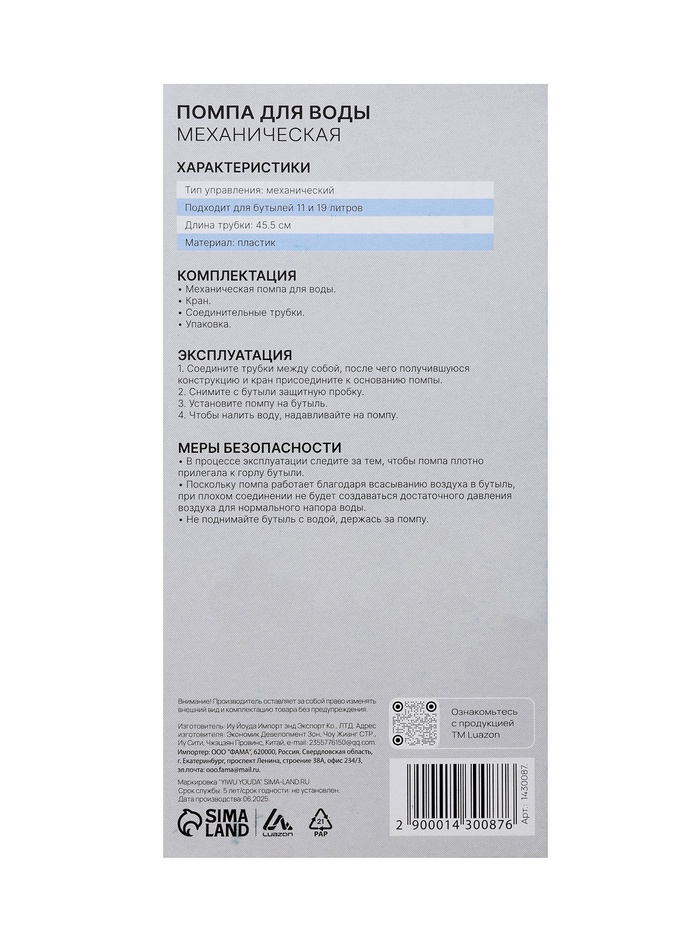 Механическая помпа Luazon — это удобное устройство, которое поможет вам разливать воду быстро и просто. Наша компактная помпа заменит кулер, ведь её можно установить прямо на горлышко бутыли объёмом 11 - 19 л, не используя дополнительные детали. Принцип работы прост и понятен – после установки устройства на горлышко бутылки нажмите на большую кнопку сверху, чтобы насос начал перекачивать воду.