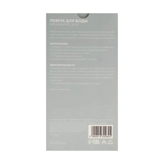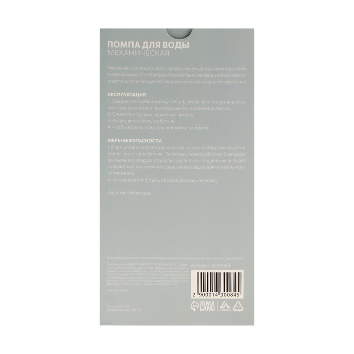 Механическая помпа Luazon — это удобное устройство, которое поможет вам разливать воду быстро и просто. Наша компактная помпа заменит кулер, ведь её можно установить прямо на горлышко бутыли объёмом 11 - 19 л, не используя дополнительные детали. Принцип работы прост и понятен – после установки устройства на горлышко бутылки нажмите на большую кнопку сверху, чтобы насос начал перекачивать воду.