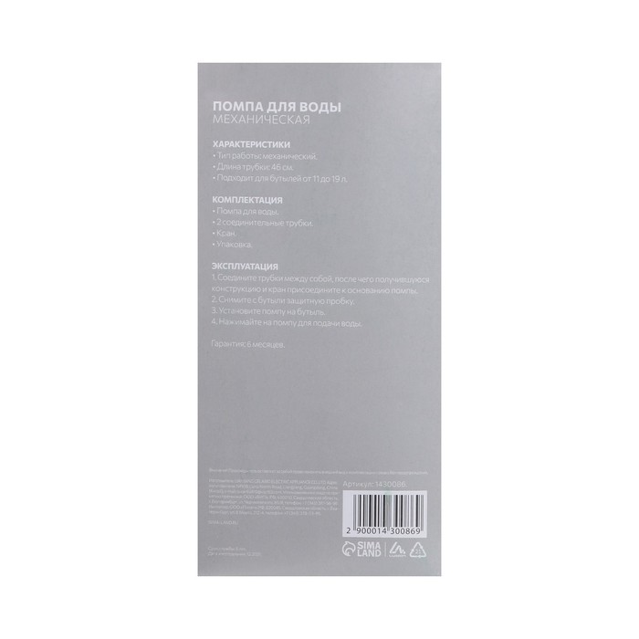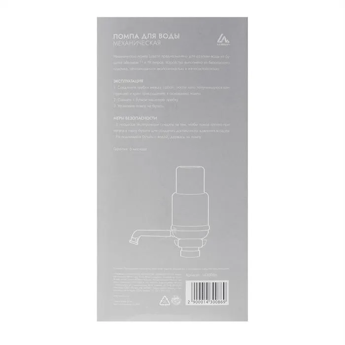 Механическая помпа Luazon — это удобное устройство, которое поможет вам разливать воду быстро и просто. Наша компактная помпа заменит кулер, ведь её можно установить прямо на горлышко бутыли объёмом 11 - 19 л, не используя дополнительные детали. Принцип работы прост и понятен – после установки устройства на горлышко бутылки нажмите на большую кнопку сверху, чтобы насос начал перекачивать воду.