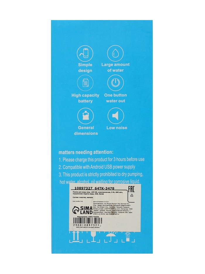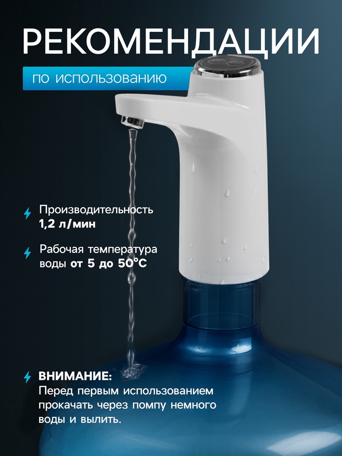 Помпа для воды LWP-06, электрическая, 5 Вт,800 мАч, порционная подача воды, АКБ, белая — Характеристики