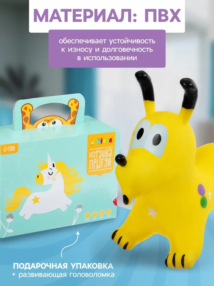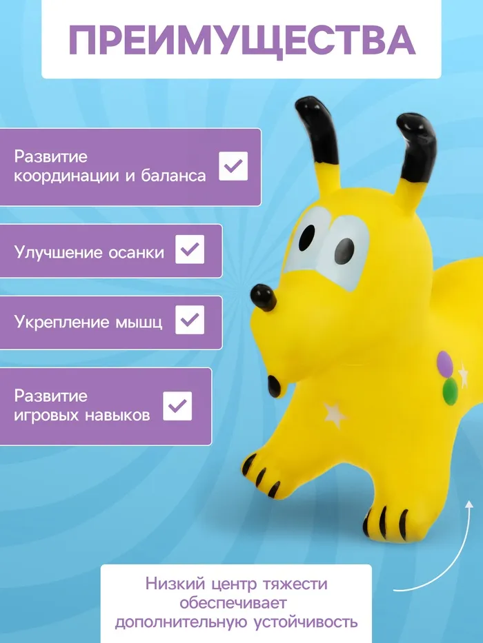 - Развитие физической активности: прыжки на игрушке способствуют укреплению мышц ног и улучшению координации движений.