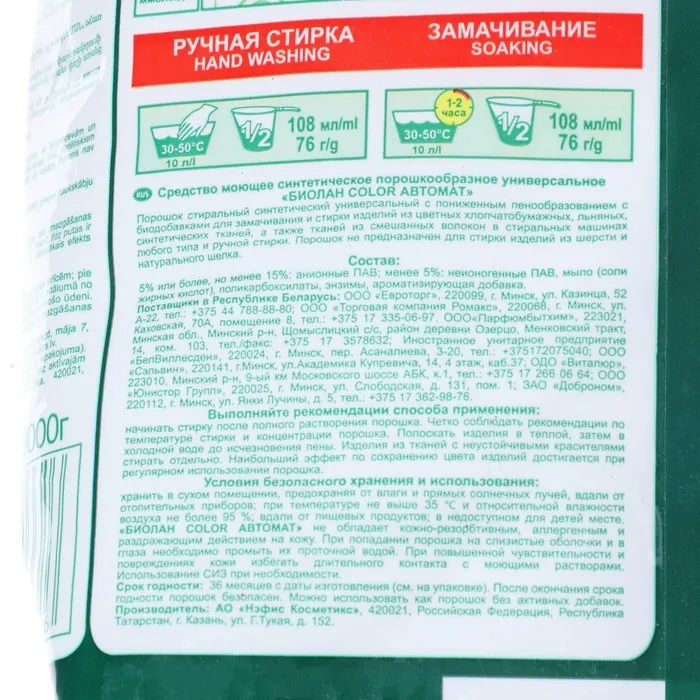 Состав: 5% или более, но менее 15%: анионные ПАВ; менее 5%: неионогенные ПАВ, мыло (соли жирных кислот), поликарбоксилаты, энзимы, ароматизирующая добавка.