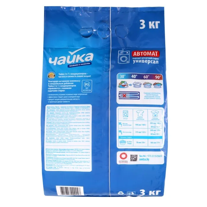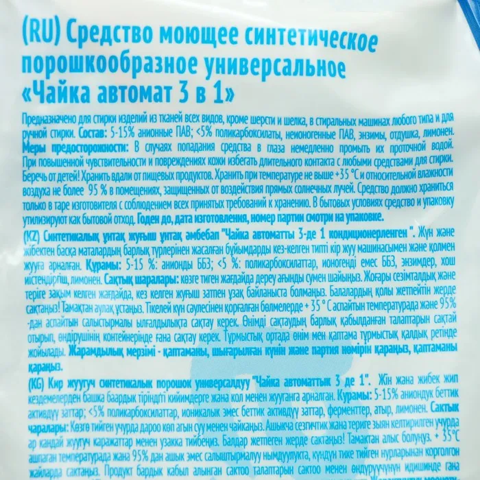 Универсальный стиральный порошок Чайка 3в1 с кондиционером содержит комплекс компонентов, благодаря которым белье остается чистым и свежим надолго! Кондиционер в составе обеспечивает вещам дополнительную мягкость. Эффективен даже при низких температурах. Не содержит фосфатов. Способ применения: 150 г. порошка на 4-5 кг. белья.