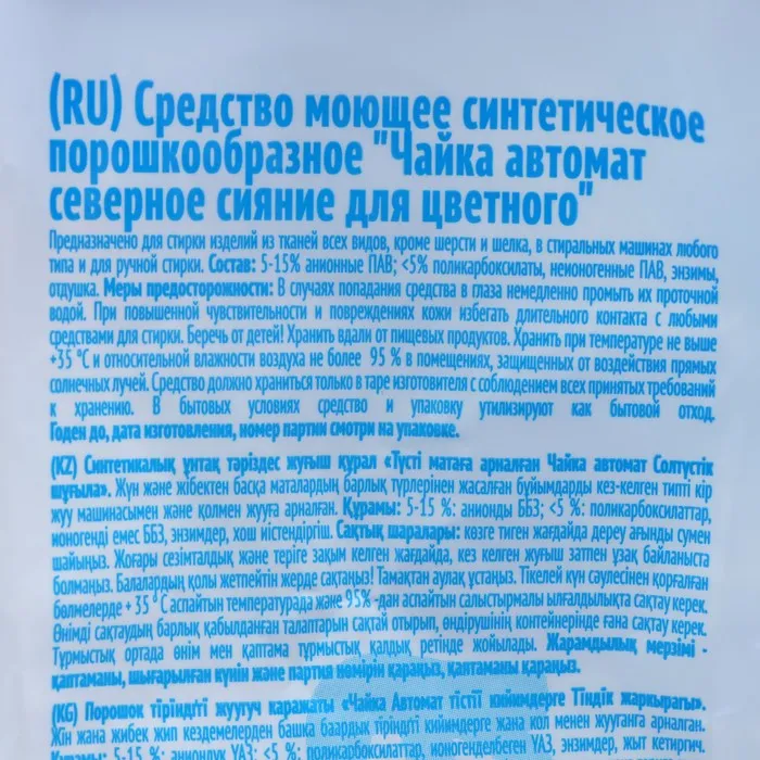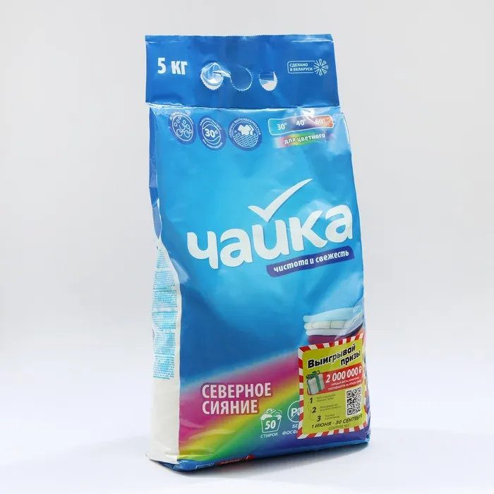 Порошок для стирки Чайка для автоматической стирки - специально создан для стирки цветного белья. Содержит компоненты, которые сохраняют яркость цветных тканей.