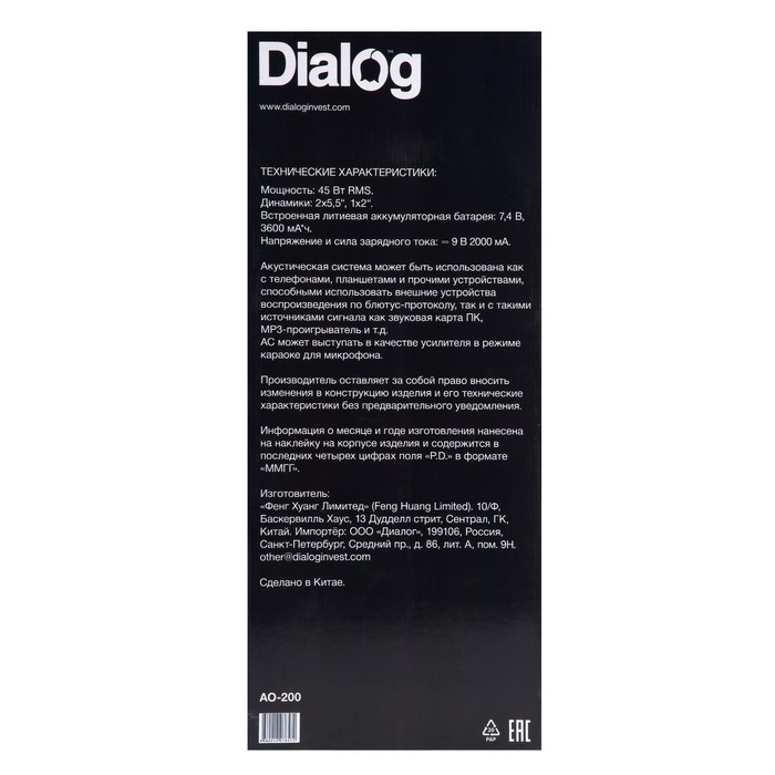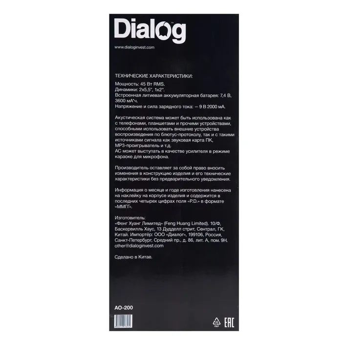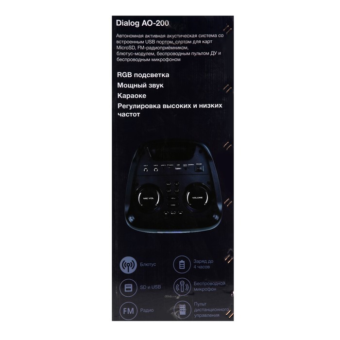 Портативная караоке система Dialog Oscar AO-200 ,45Вт, FM, AUX, USB, BT, беспр.микр,3600 мАч — Характеристики