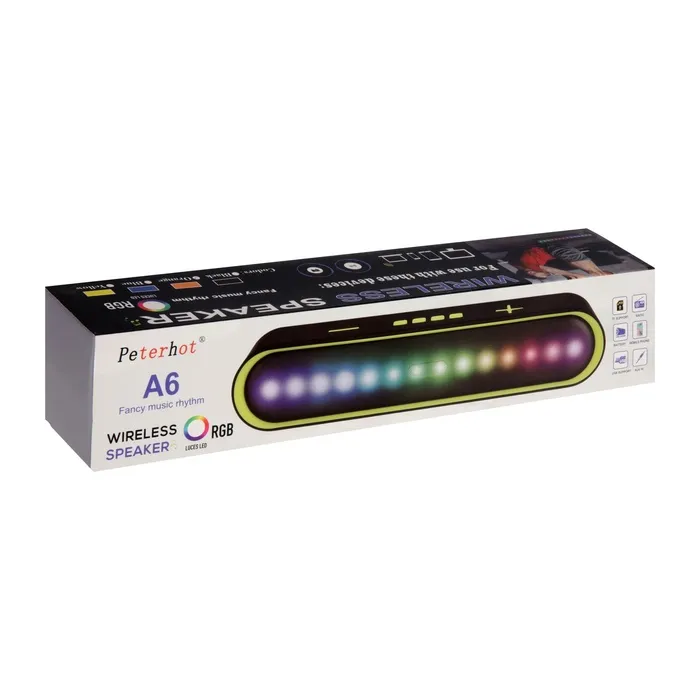 С колонкой A6 вы не только получите чёткий и громкий звук, но и насладитесь эффектной подсветкой, которая подстраивается под музыку, создавая уникальную атмосферу. Встроенный FM-тюнер подарит вам возможность слушать любимые радиостанции в любом месте, а наличие нескольких вариантов подключения (Bluetooth 5.0, Jack 3.5 мм, TF, USB и USB Type-C) позволяет подключать её к любым устройствам.