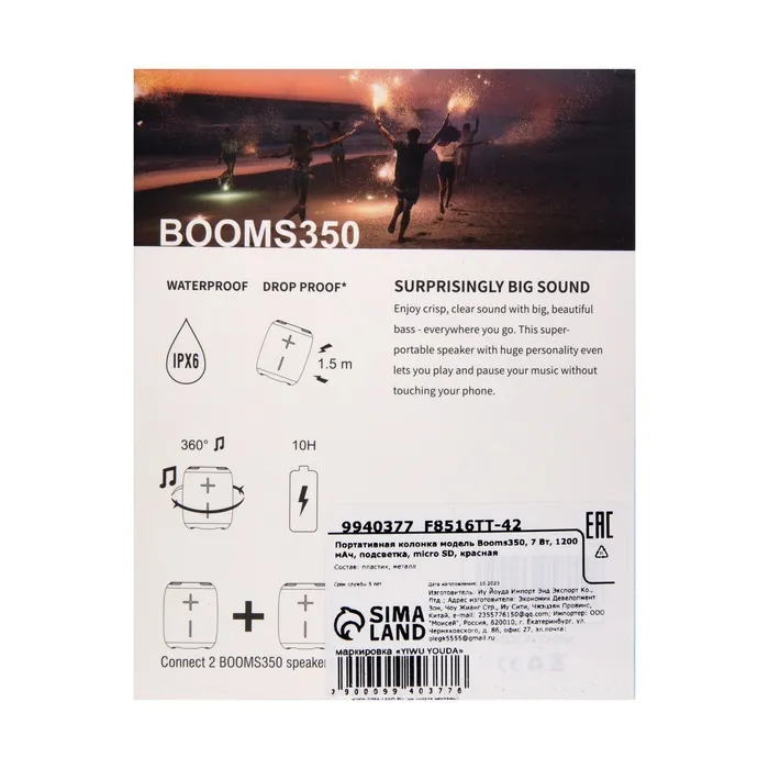 Портативная колонка Booms350, 7 Вт, 1200 мАч, подсветка, micro SD, красная — Характеристики
