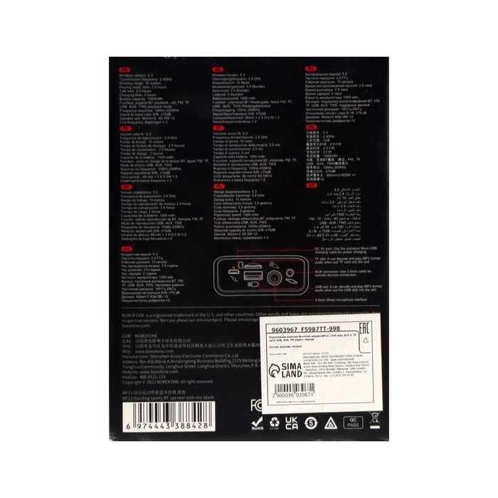 Портативная колонка Borofone модель BP13,10 Вт,1500 мАч,BT5.3,TFcard,USB,AUX,FM-радио,чёрная — Характеристики