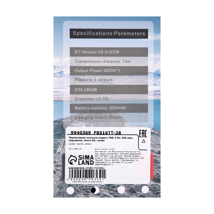 Портативная колонка F68, 5 Вт, 600 мАч, подсветка. micro SD, синяя — Характеристики