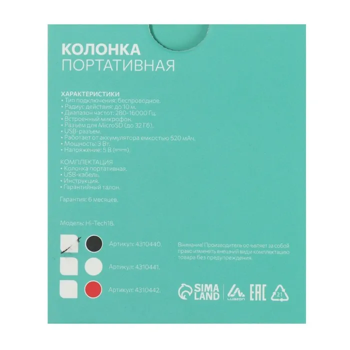 Портативная колонка Luazon Hi-Tech18, 3 Вт, 520 мАч, microSD, USB, черная — Характеристики