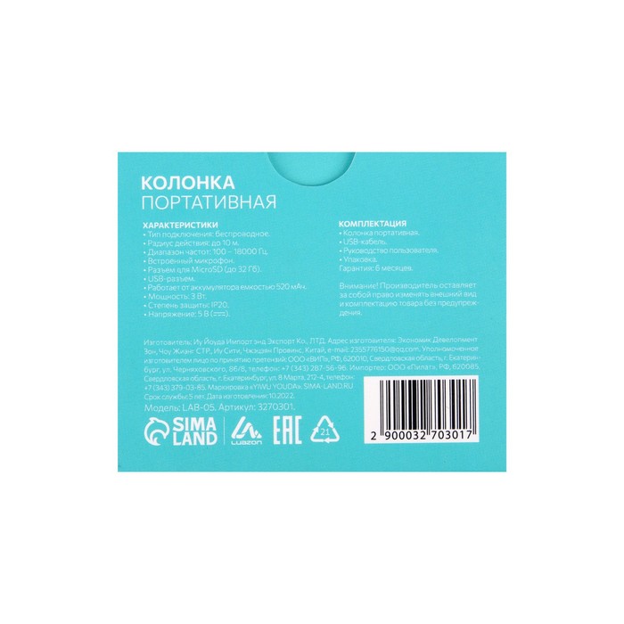 Портативная колонка Luazon LAB-05, 3 Вт, 520 мАч, Bluetooth, USB, microSD, microUSB, серебристый — Характеристики
