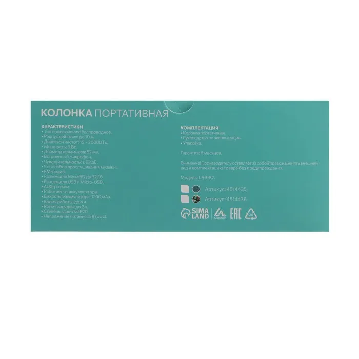 Портативная колонка Luazon LAB-52, 6 Вт, microSD, AUX, USB, зеленая — Характеристики