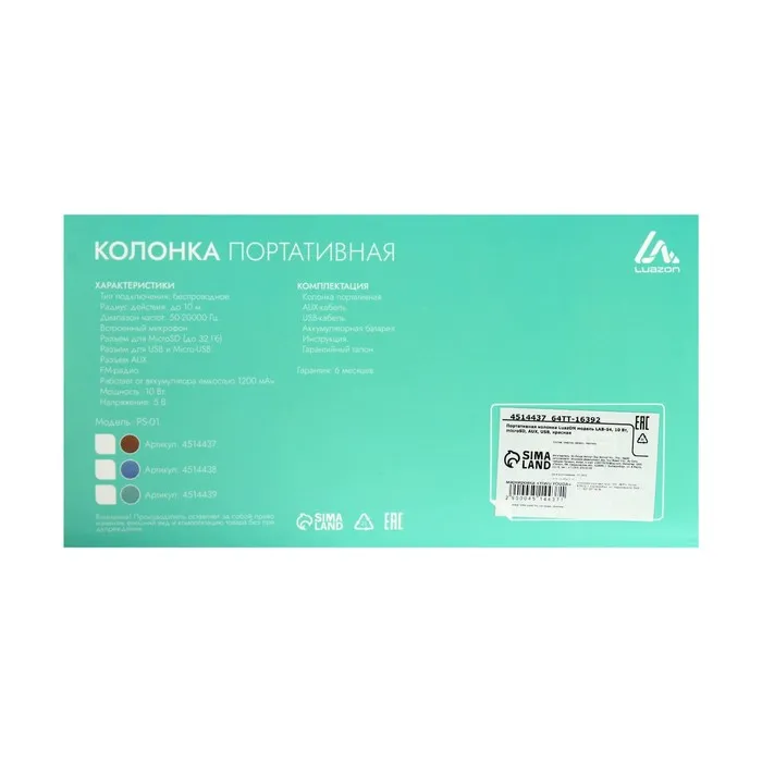 Портативная колонка Luazon LAB-54, 10 Вт, 1200 мАч, microSD, AUX, USB, красная — Характеристики