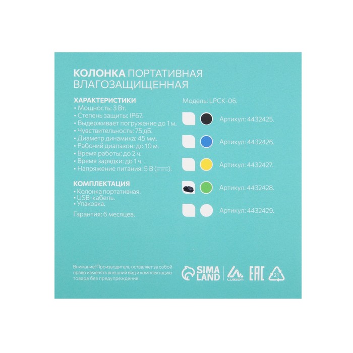 Портативная колонка LuazON LPCK-06, 150 мАч, водостойкая, на присоске, зеленая — Характеристики