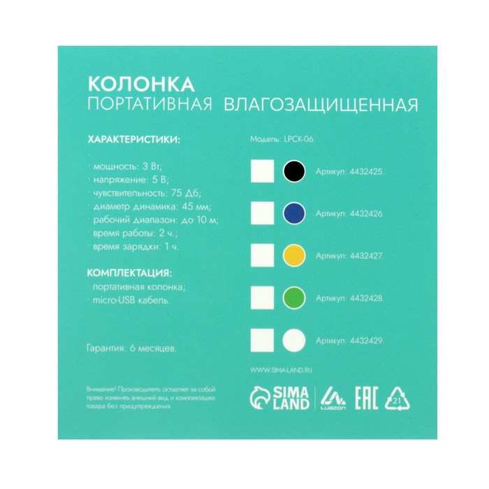 Портативная колонка LuazON LPCK-06 — это небольшое, но мощное устройство для прослушивания музыки в любых условиях. Благодаря водостойкому корпусу и присоске, колонка подходит для использования на улице, в ванной или на кухне, где требуется компактное и устойчивое решение.