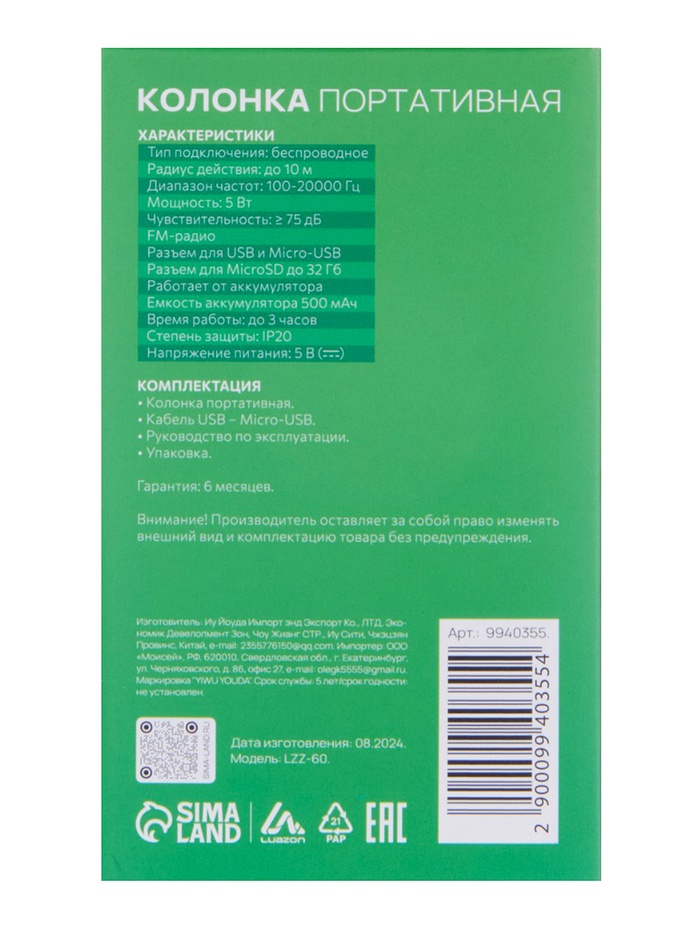 Портативная колонка Luazon LZZ-60, 5 Вт, 500 мАч, подсветка, micro SD, хаки — Характеристики