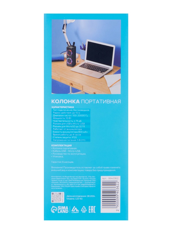 Портативная колонка Luazon LZZ-62, 10 Вт, 800 мАч, подсветка, micro SD, чёрная — Характеристики