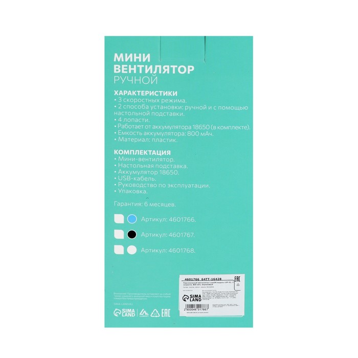Портативный ручной вентилятор Luazon LOF-02, 3 скорости, на аккумуляторе, 800 мАч, бирюзовый — Характеристики