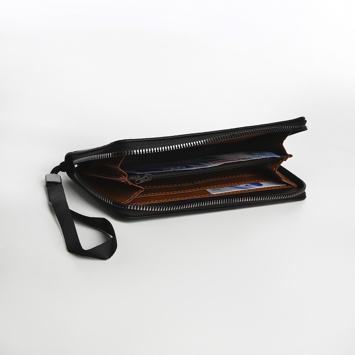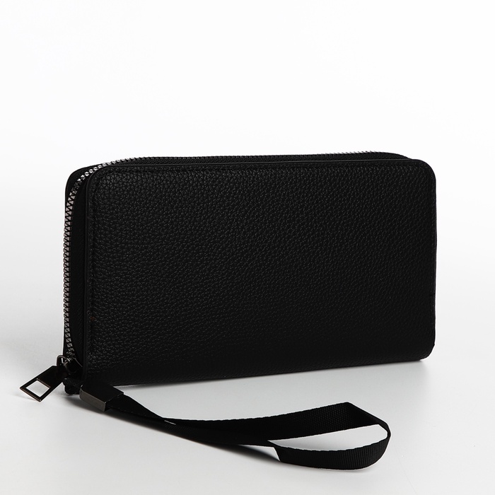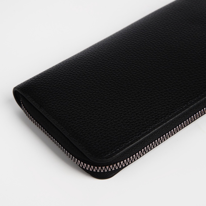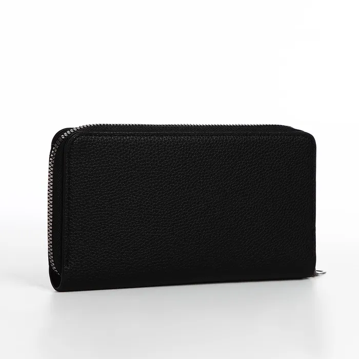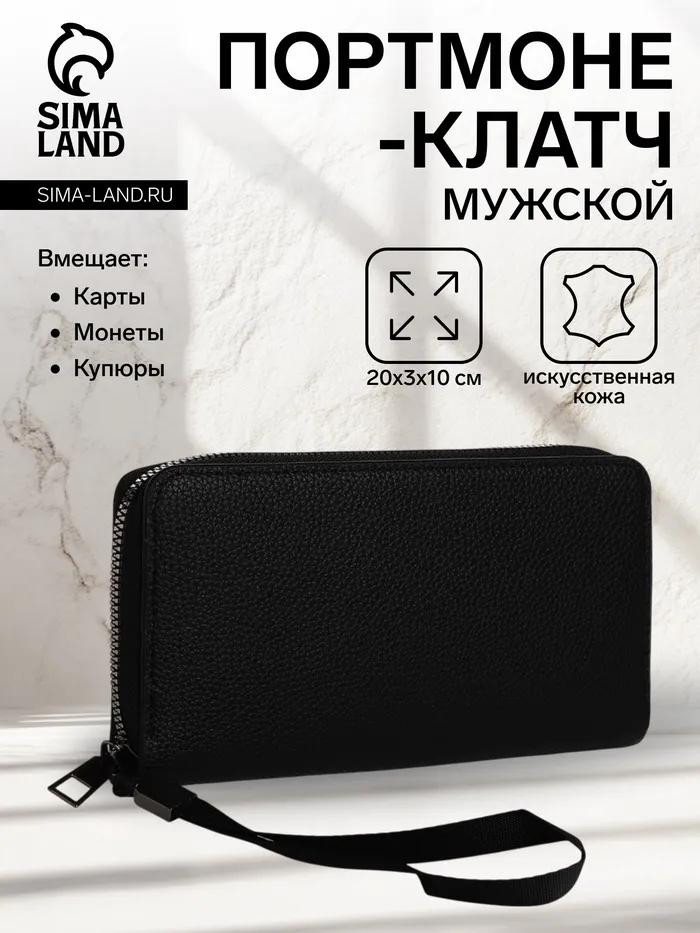 Мужское портмоне с застёжкой-молнией организует хранение банкнот, карт и мелочи. Чёрный материал из искусственной кожи скрывает повседневные следы использования. Внутренние отделения распределяют содержимое так, что вы находите нужное без лишних поисков.