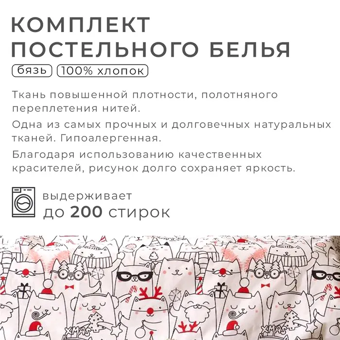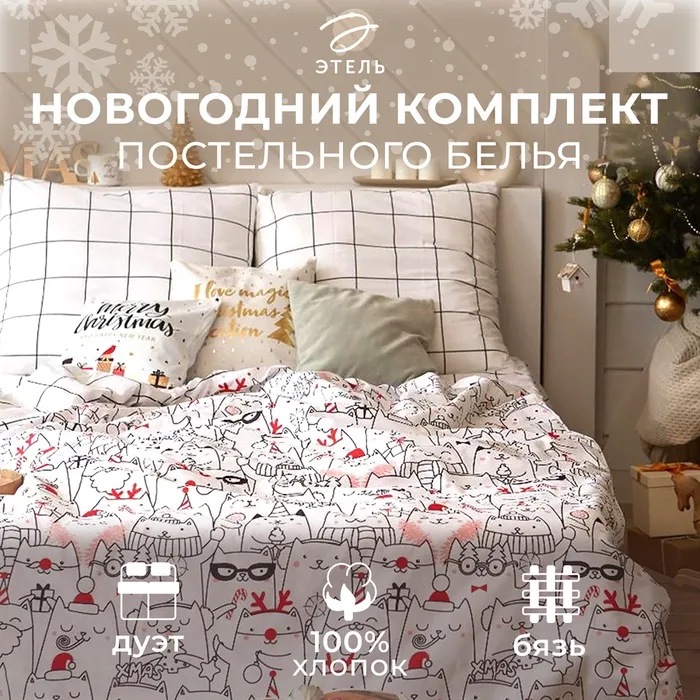Постельное белье новогоднее Этель Дуэт Xmas cat 143*215 см - 2 штуки, 240*220 см, 70*70 см - 2 штуки — Характеристики