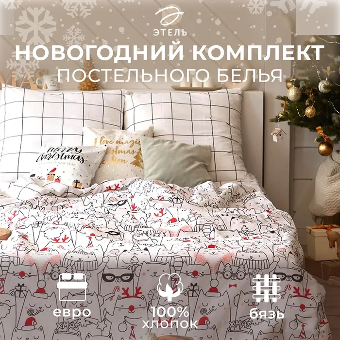 Постельное белье новогоднее Этель Евро Xmas cat 200*217 см, 240*220 см, 70*70 см - 2 штуки — Характеристики