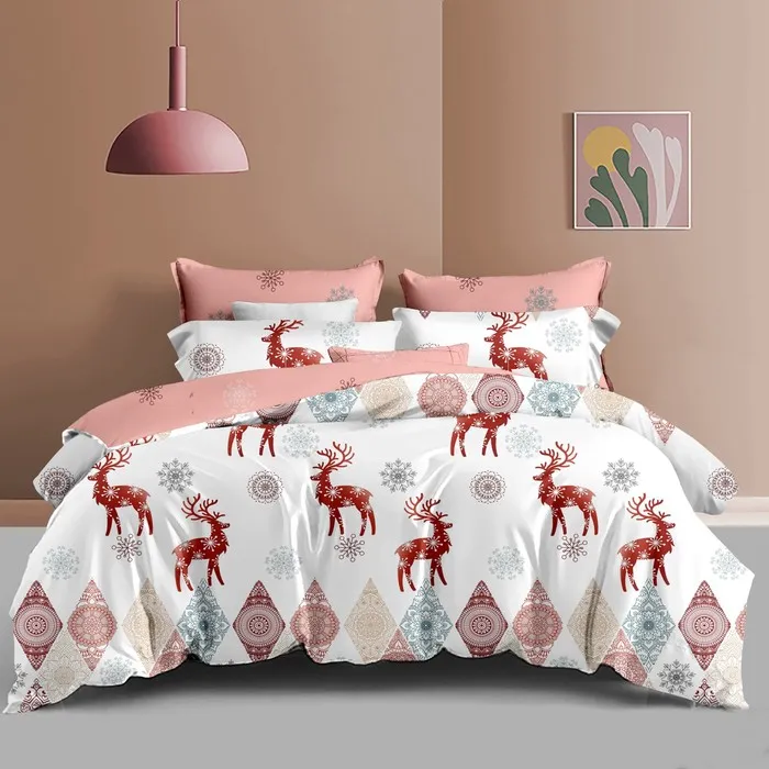 Этот комплект отличается стильным дизайном, сочетающим в себе утонченность розового цвета и праздничную атмосферу Нового года. Его мягкость и гладкая фактура обеспечивают приятный тактильный контакт с кожей, создавая идеальное окружение для спокойного сна и отдыха.