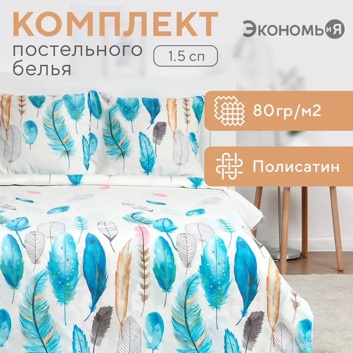 Постельное бельё Экономь и Я 1,5 сп "Перья" 147х215 см, 150х215 см, 70х70 см-2 шт, полисатин, 80г/м² — Характеристики