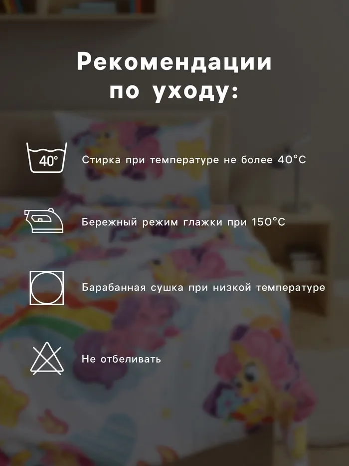При соблюдении простых рекомендаций по уходу постельное бельё прослужит долго, сохранив яркость красок и нежность ткани. Стирать изделия нужно при температуре не выше 40 °С без использования отбеливающих средств. Гладить — при температуре не более 150 °C. Химчистка запрещена.