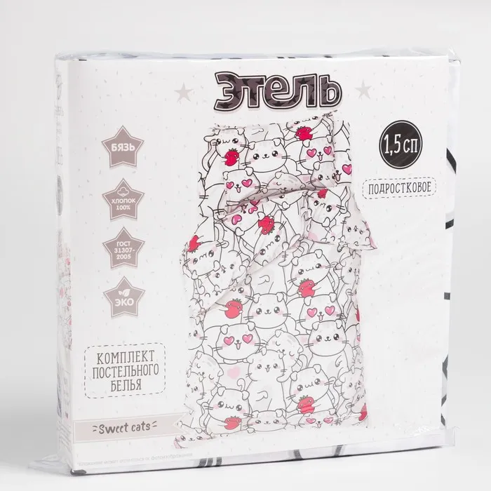 Постельное бельё Этель 1,5 сп "Sweet cats", 143х215 см, 150х214 см, 50х70 см -1 шт, 100% хлопок, бязь — Характеристики