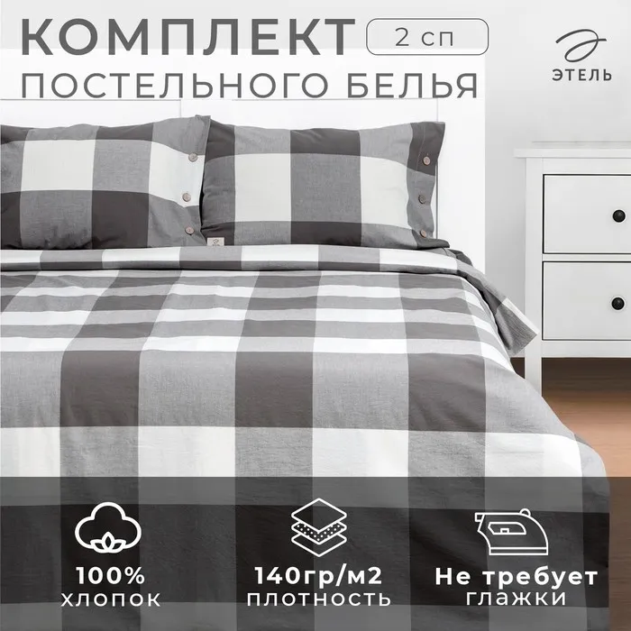 Постельное бельё Этель 2 сп «Серая клетка» 180х210 см, 220х240 см, 50х70-2шт,100% жатый хлопок,140гр/м2 — Характеристики