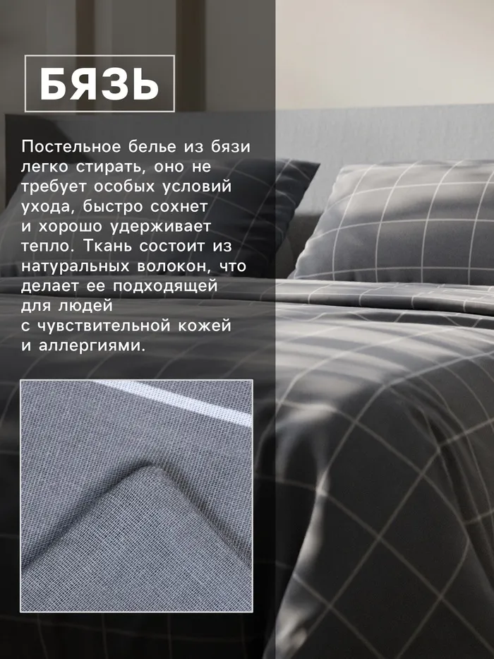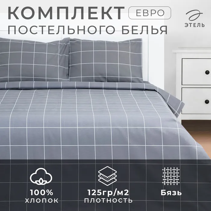Постельное бельё Этель Евро «Клетка», серое, 200×215, 220×240, 50×70-2 штуки, бязь, 125 г/м² — Характеристики