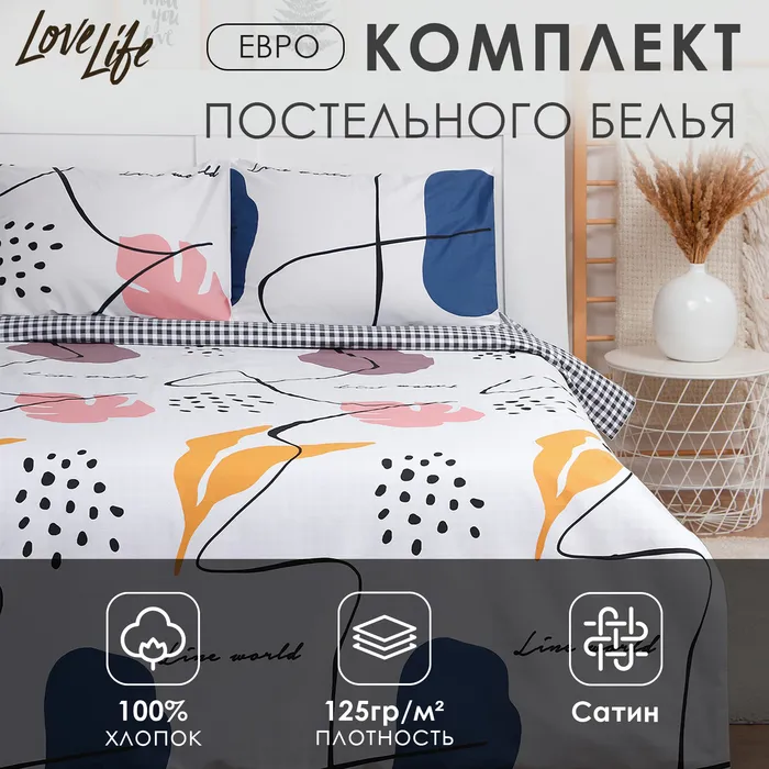 Постельное бельё LoveLife евро "Line world" 200х217см, 225х240см, 50х70см-2шт, 100% хлопок, сатин, 125г/м² — Характеристики