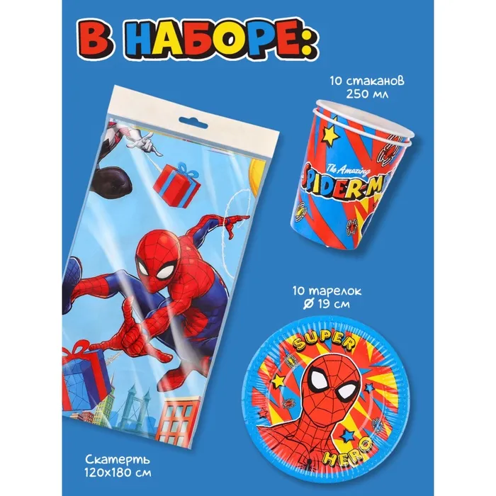 Набор одноразовой бумажной посуды на 10 персон — идеальное решение для тематического праздника! В комплекте: стаканы, тарелки и скатерть с ярким принтом «Человек-паук». Высокое качество, прочные материалы, стильный дизайн с любимым супергероем. Удобно использовать на дне рождения, вечеринке или утреннике. Быстро и красиво оформите стол — останется только праздновать! Пусть праздник будет по-настоящему масштабным и героическим!
