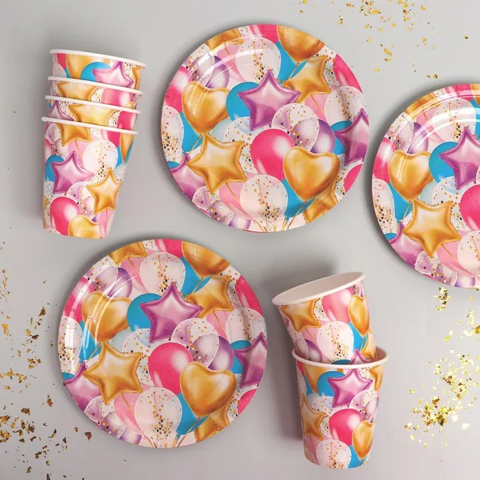 Представьте себе праздничный стол, украшенный яркой посудой с праздничным декором! Весь набор выполнен в красочном дизайне с изображением свечей, звезд и надписью "С днем рождения". Тарелки и стаканчики изготовлены из плотного картона, что гарантирует их прочность. После праздника вы просто выбросите ее, не тратя время на мытье. Этот набор идеально подойдет для праздничного застолья на день рождения, ведь он создаст атмосферу радости и веселья. Набор упакован в удобный пакет, что делает его идеальным вариантом для подарка.